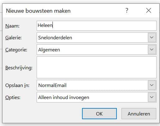 Je kunt in plaats van Invoegen ook kiezen voor  Alt F3. Geef een naam en selecteer bij Galerie Snelonderdelen.