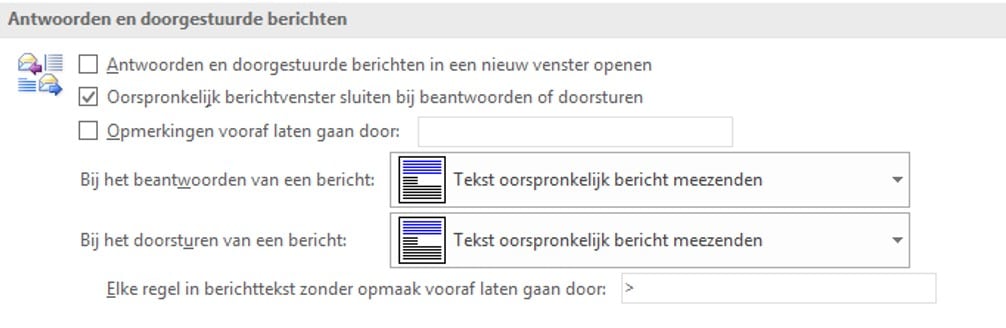 Dus snel je mail verwerken. Hoe zorg je er nu voor dat je al die vensters niet open hebt staan? Dit kun je doen door je venster automatisch te laten sluiten na beantwoorden en doorsturen.