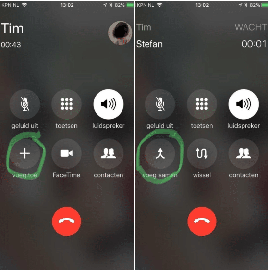 - Je belt de eerste persoon. Zodra deze opgenomen heeft, verschijnt er een plusteken in je scherm met de tekst ‘voeg toe’.